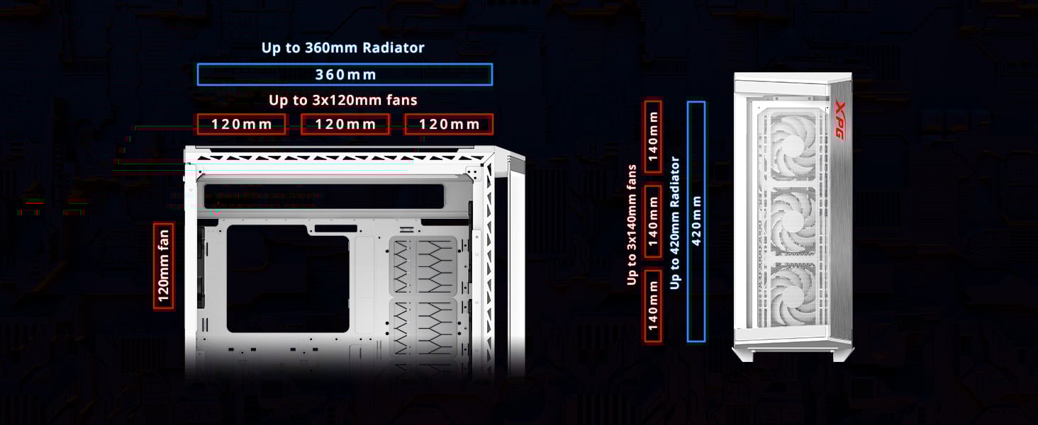 Ciesz się wyjątkowymi funkcjami chłodzenia BATTLECRUISER II, który charakteryzuje się układem zapewniającym duży przepływ powietrza, czterema 120-milimetrowymi wentylatorami ARGB i obsługą radiatora o szerokości do 420 mm z przodu obudowy.