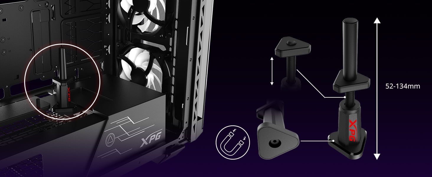 Dzięki regulowanej wysokości w zakresie 52–134 mm i wytrzymałości pozwalającej na utrzymanie nawet najcięższych kart graficznych obecnej generacji dołączony uchwyt GPU do montażu bez użycia narzędzi umożliwia wszechstronne złożenie komputera, które sprawdzi się w przypadku każdej standardowej konfiguracji komputera typu „zrób to sam”.
