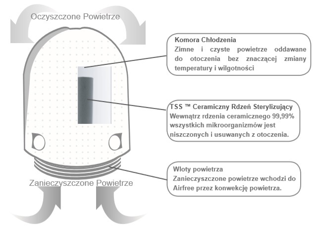 Airfree P80 to jedyny oczyszczacz, który niszczy większość mikroorganizmów. Powietrze zasysane jest na zasadzie konwekcji, następnie przechodzi przez komorę spalania, w której panuje temperatura 200°C. W tak ekstremalnych warunkach zostają zniszczone roztocza, pleśnie, grzyby, przetrwalniki i nieprzyjemne zapachy. Dzięki zastosowaniu innowacyjnej technologii TSS, nie ma konieczności użycia filtrów, co znacznie zmniejsza koszty ekploatacji, a w przeciwieństwie do innego typu oczyszczaczy, Airfree nie dopuszcza do ponownego namnażania się drobnoustrojów.