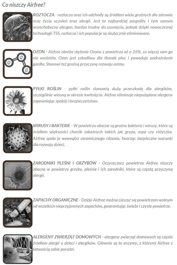 wspomagająco przy chorobach płuc - Airfree obniża stężenie ozonu, jak i alergenów i szkodliwych mikroorganizmów z powietrza, dzięki czemu znacznie odciąża organizmy osób wrażliwych, z problemami przy oddychaniu.