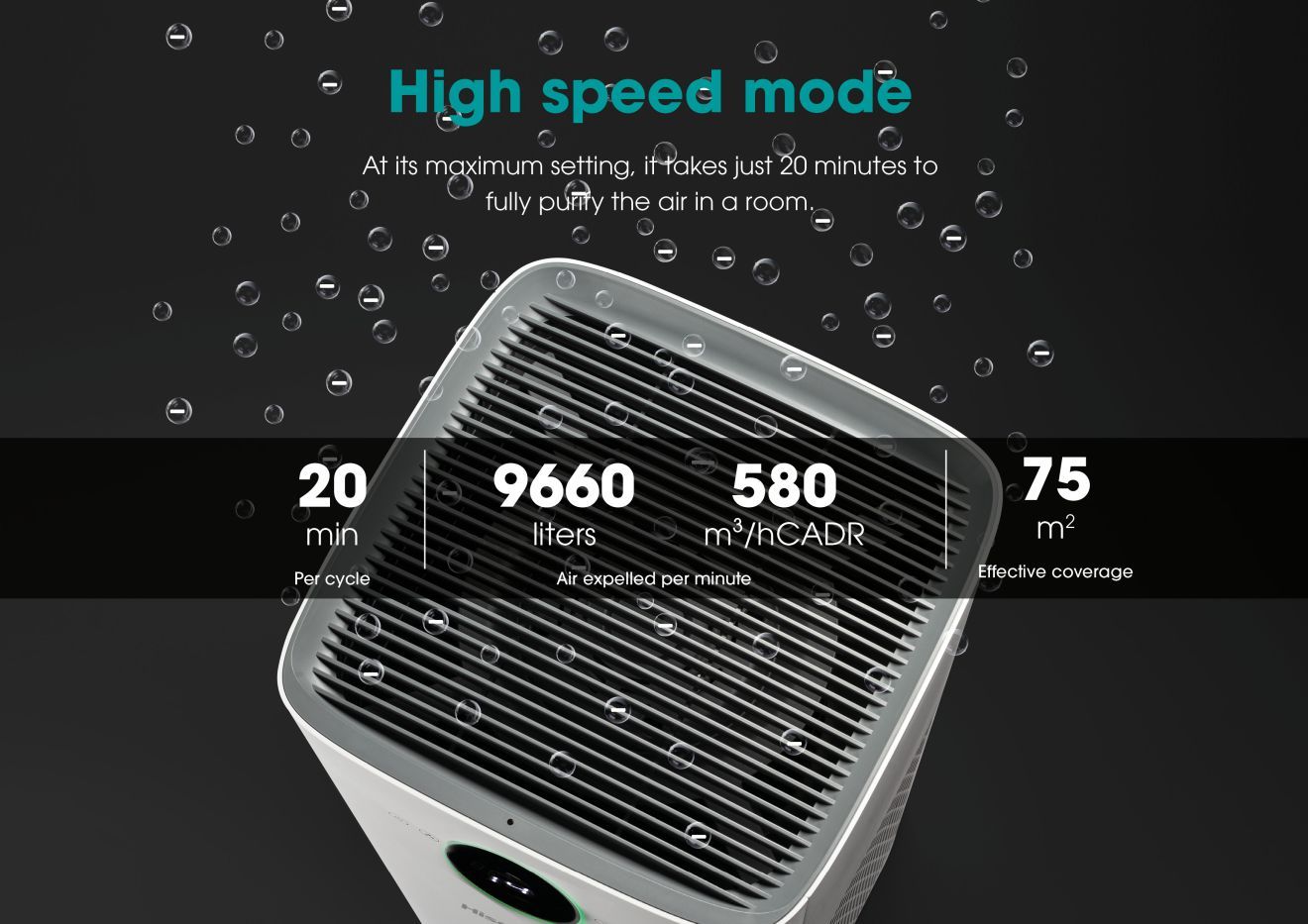 Oczyszczacz powietrza Hisense AP580HSN oferuje najwyższą jakość powietrza, dzięki zaawansowanej technologii cyrkulacji z efektywnym zasięgiem- do 75m2