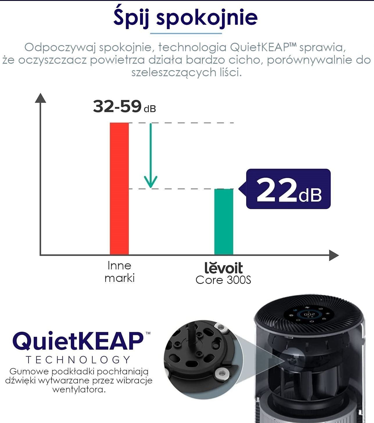 Oczyszczacz powietrza posiadający funkcję trybu nocnego zmniejsza tryb pracy wentylatora do minimum, dzięki czemu redukuje swój poziom hałasu. Dodatkowo podświetlenie przycisków i wskaźnik jakości powietrza zostają przyciemnione. Funkcja ta zapewnia domownikom jednocześnie spokojny sen oraz czyste powietrze w pomieszczeniu.