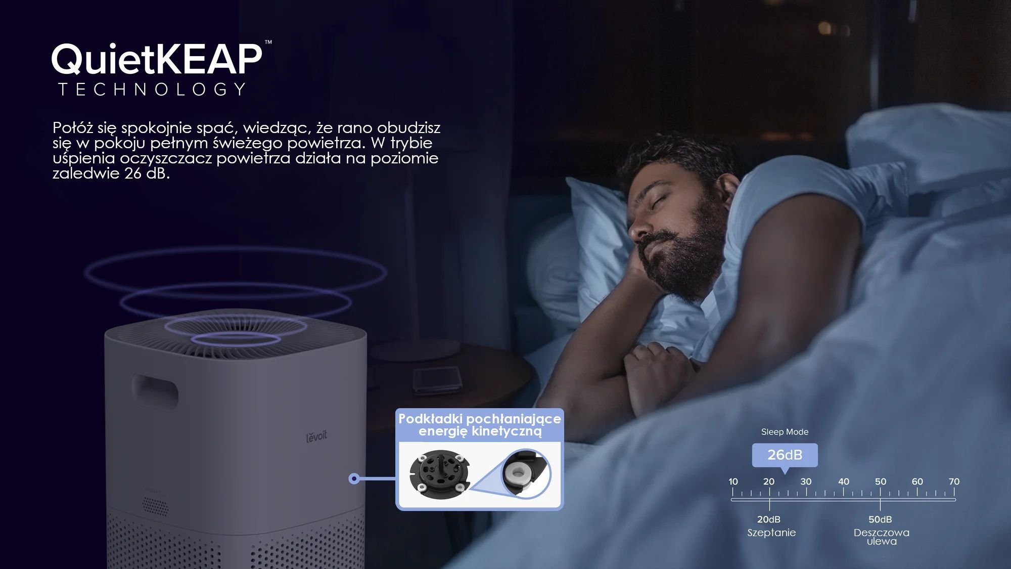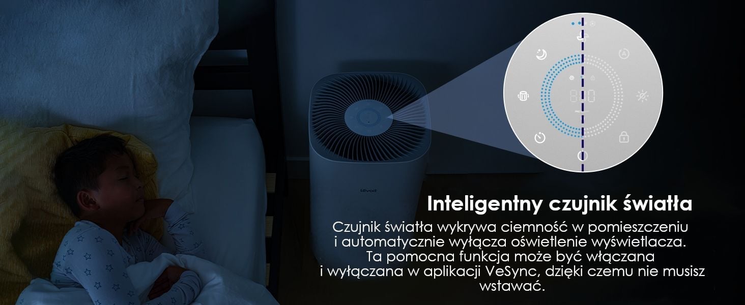 Oczyszczacz powietrza posiadający funkcję trybu nocnego zmniejsza tryb pracy wentylatora do minimum, dzięki czemu redukuje swój poziom hałasu. Dodatkowo podświetlenie przycisków i wskaźnik jakości powietrza zostają przyciemnione. Funkcja ta zapewnia domownikom jednocześnie spokojny sen oraz czyste powietrze w pomieszczeniu.