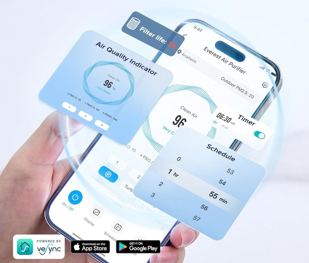 Sterowanie oczyszczaczem poprzez aplikację VeSync i głos (Alexa, Asystent Google) oferuje pełną kontrolę, łatwość obsługi oraz nowoczesne podejście do utrzymania czystego i zdrowego otoczenia w Twoim domu.