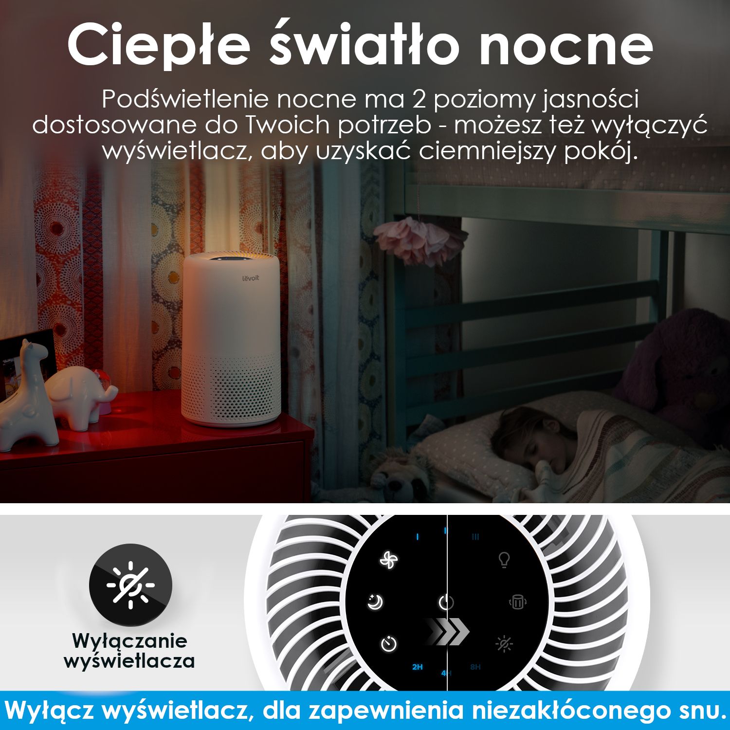 Oczyszczacz powietrza posiadający funkcję trybu nocnego zmniejsza tryb pracy wentylatora do minimum, dzięki czemu redukuje swój poziom hałasu. Dodatkowo podświetlenie przycisków i wskaźnik jakości powietrza zostają przyciemnione. Funkcja ta zapewnia domownikom jednocześnie spokojny sen oraz czyste powietrze w pomieszczeniu.