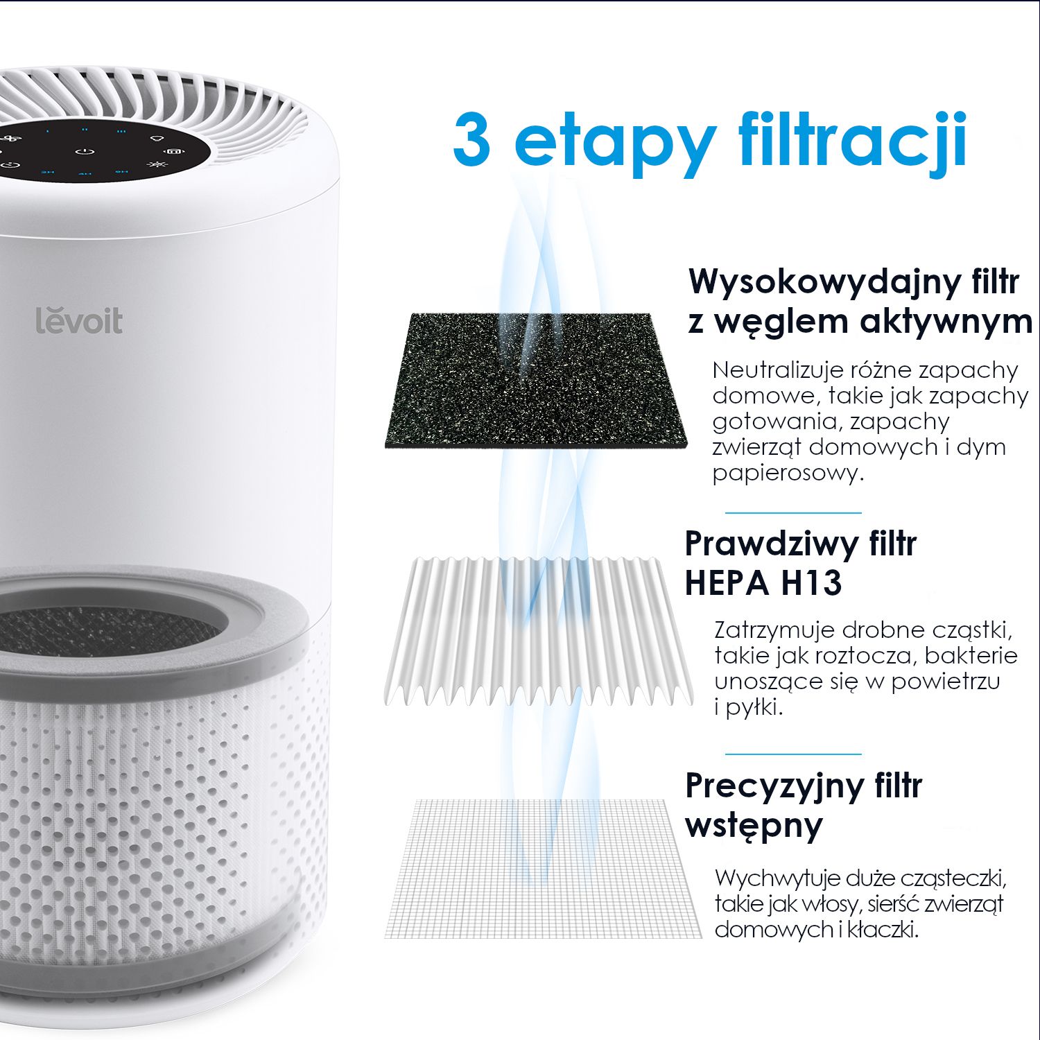 - 3-stopniowa filtracja: nylonowy filtr wstępny, filtr HEPA H13, wysoce wydajny filtr węglowy