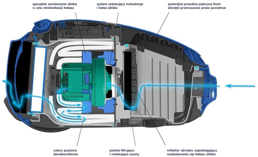 Dzięki specjalnej izolacji i mocowaniu silnika, podwójnej pokrywie oraz czterem dźwiękochłonnym poziomom udało się uzyskać najcichszy odkurzacz - tylko 57 dB(A)*.