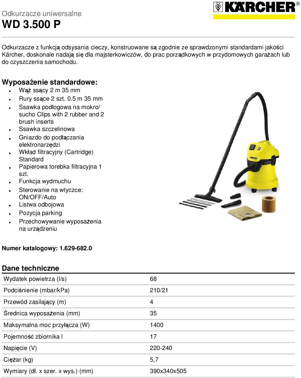WD 3.500 P to odkurzacz uniwersalny klasy wprowadzającej wyposażony w duży 17-litrowy zbiornik nazanieczyszczenia tworzywa sztucznego oraz filtr typu Cartridge. Urządzenie posiada funkcję wydmuchu,dzięki czemu brud i liście można z łatwością wymieść z trudno dostępnych miejsc.WD 3.500 P współpracuje z elektronarzędziami umożliwiając odsysanie pyłu, opiłków drzewnych i wiórówbezpośrednio w miejscu ich powstawania. Dzięki temu zostaną one usunięte zanim zdążą osiąść napodłodze i meblach, a osoba obsługująca narzędzie nie wdycha pyłu.
