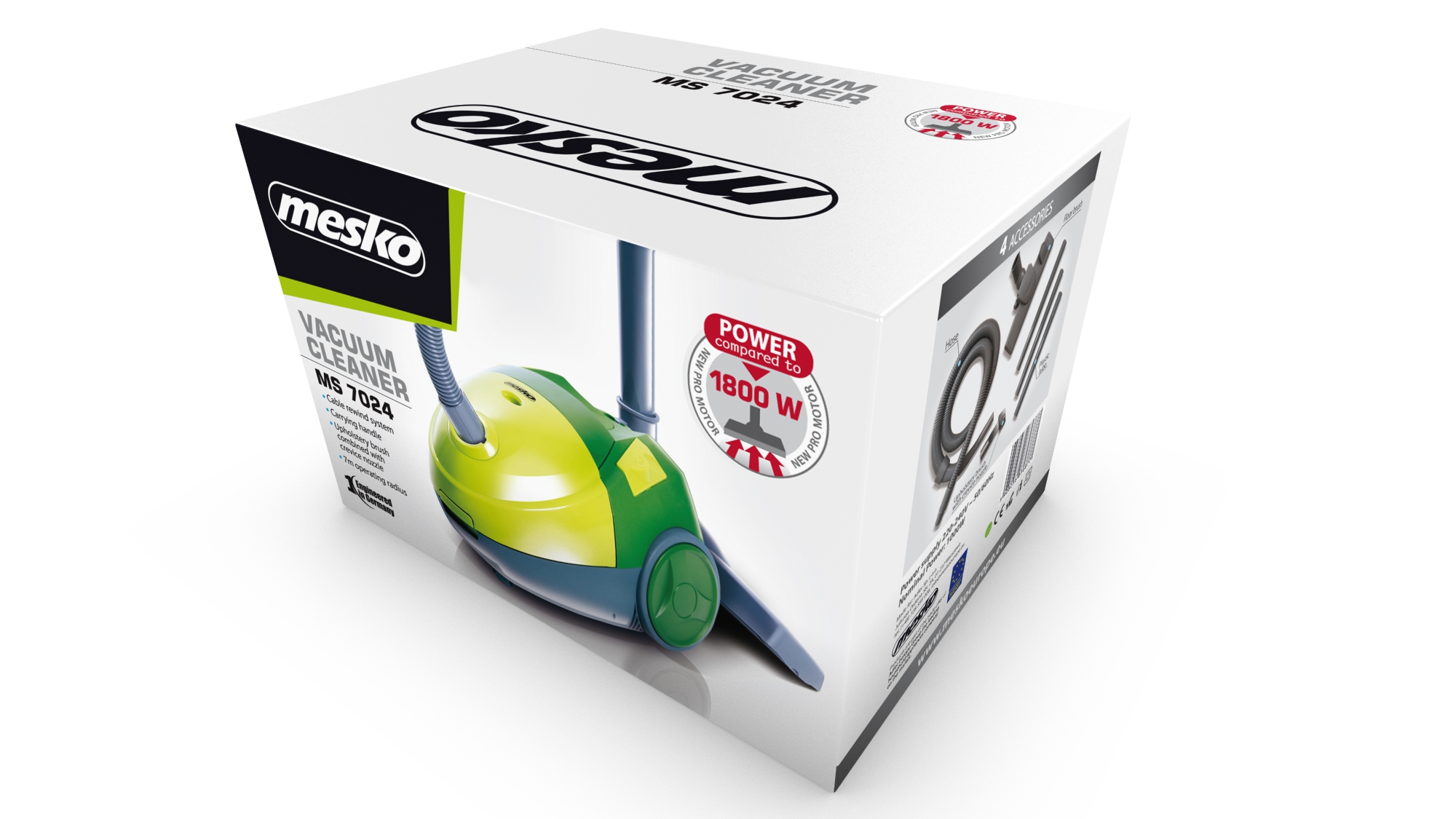 W kolorowym opakowaniu znajduje się dobrze zabezpieczony do transportu odkurzacz Mesko MS 7024 oraz instrukcja obsługi w 13 językach.