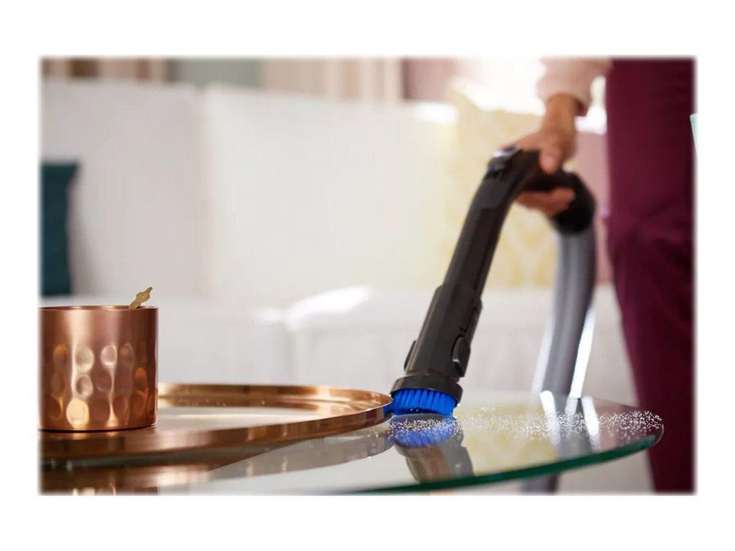 W zestawie z odkurzaczem cyklonowym znajdziesz wyjątkową nasadkę TriActive+. Cechuje się ona potrójnym działaniem – zbiera duże zabrudzenia pojawiające się na jej drodze, ale też wyciąga zalegające w głębi włókien drobinki kurzu. Co więcej, wyposażona została w boczne kanały, świetnie wychwytujące brud wzdłuż ścian i szafek.