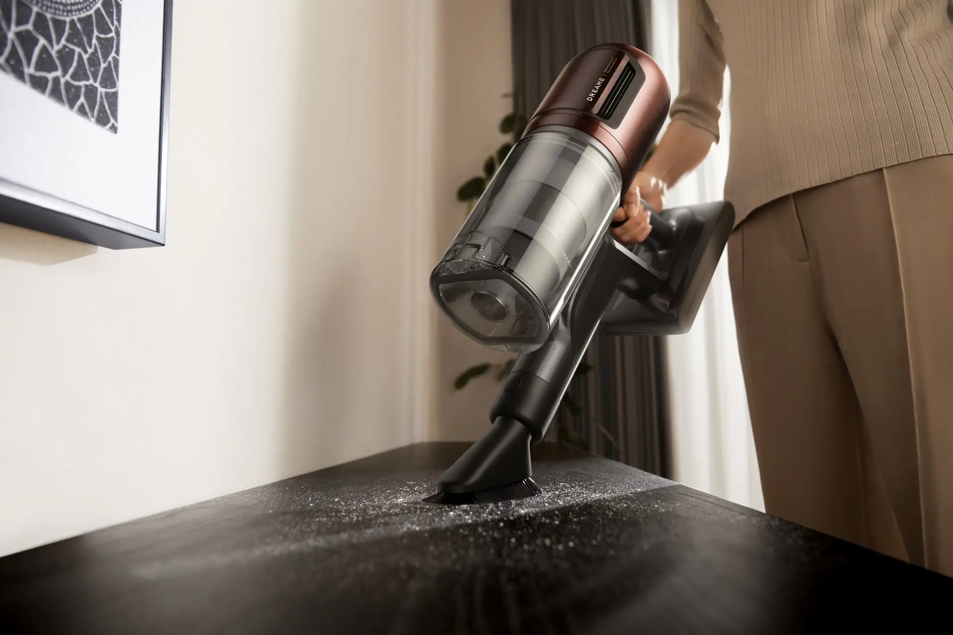 Stacja dokująca nie tylko służy do ładowania urządzenia, ale także umożliwia przechowywanie wszystkich niezbędnych akcesoriów w jednym miejscu. Dzięki temu zawsze masz pod ręką odpowiednie końcówki, a całość pozostaje uporządkowana. Elementy takie jak pojemnik na kurz, filtr oraz wałek szczotki można łatwo wyjąć i przepłukać pod bieżącą wodą, co znacząco ułatwia utrzymanie odkurzacza w czystości. Dodatkowo urządzenie umożliwia samodzielną wymianę akumulatora, co pozwala przedłużyć czas pracy bez potrzeby kupowania nowego sprzętu.