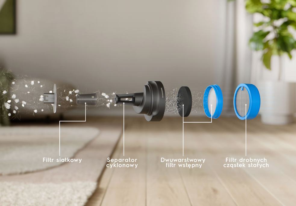 Ten model odkurzacza został zaprojektowany ze szczególnym naciskiem na higienę i jakość powietrza w Twoim domu. Wykorzystuje on innowacyjny, 5-stopniowy system filtracji, który jest w stanie usunąć aż do 99,9% mikrodrobin kurzu i zanieczyszczeń o wielkości od 0,3 do 10 mikrometrów. Takie rozwiązanie sprawia, że powietrze wydostające się z urządzenia jest czyste, co stanowi ogromną zaletę dla alergików oraz rodziców małych dzieci. Sprzątając podłogi, jednocześnie dbasz o zdrowszą atmosferę w całym pomieszczeniu.
