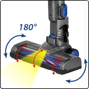 Dzięki obrotowemu podwójnemu przegubowi o 180° (oznaczony na niebiesko) uzyskujesz optymalną mobilność podczas korzystania z odkurzacza ProfiCare. Elektrycznie obrotowa szczotka podłogowa (zaznaczona na czerwono) jest idealna dla dokładnego czyszczenia. Ponadto PC-BS 3085 A jest wyposażony w oświetlenie LED, które zapewnia lepszą widoczność ciemniejszych obszarów.