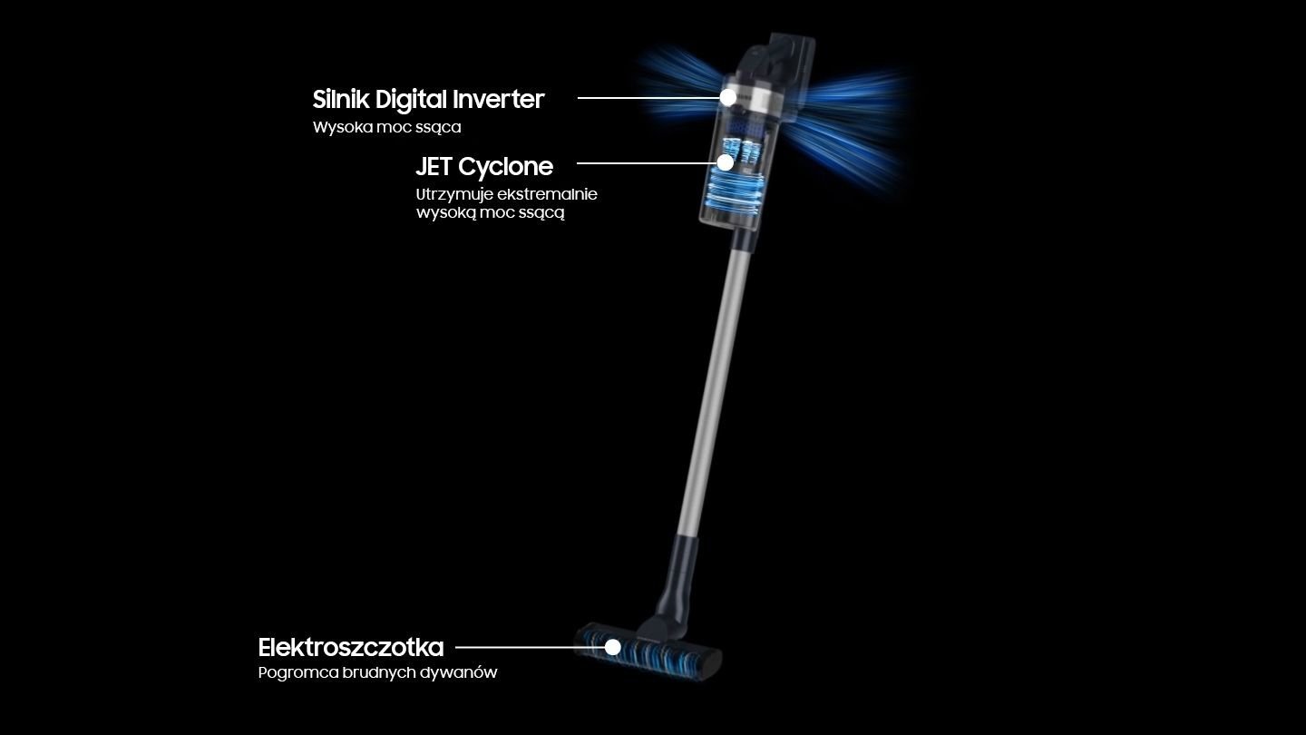 Dzięki wysokowydajnej, wielocyklonowej technologii Jet Cyclone możesz cieszyć się czystszym powietrzem i ekstremalną mocą ssącą. System obejmujący 9 cyklonów i 27 wlotów powietrza tworzy optymalną ścieżkę, która umożliwia zminimalizowanie strat ssania. Jednocześnie wychwytuje drobne cząsteczki kurzu. Elektroszczotka zbiera drobne cząsteczki kurzu zarówno z dywanu, jak i z twardych podłóg. Wykonuje około 3750 obrotów na minutę. Głowica, która obraca się o 180 stopni ułatwia zmianę kierunku i odkurzenie każdego rogu. Czyszczenie szczotki jest niezwykle proste, wystarczy jedno kliknięcie aby ją odłączyć.