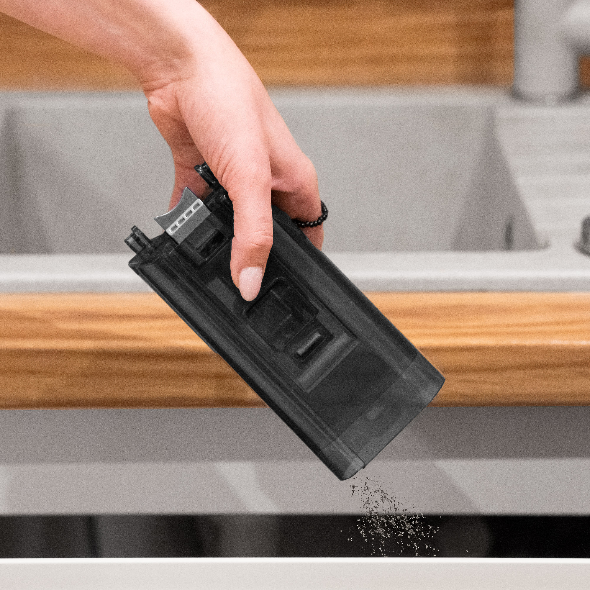 Prosty system opróżniania pojemnika na kurz sprawia, że sprzątanie jest higieniczne i szybkie. Wystarczy jeden ruch, aby opróżnić zbiornik, co pozwala uniknąć kontaktu z brudem i utrzymać urządzenie w czystości.