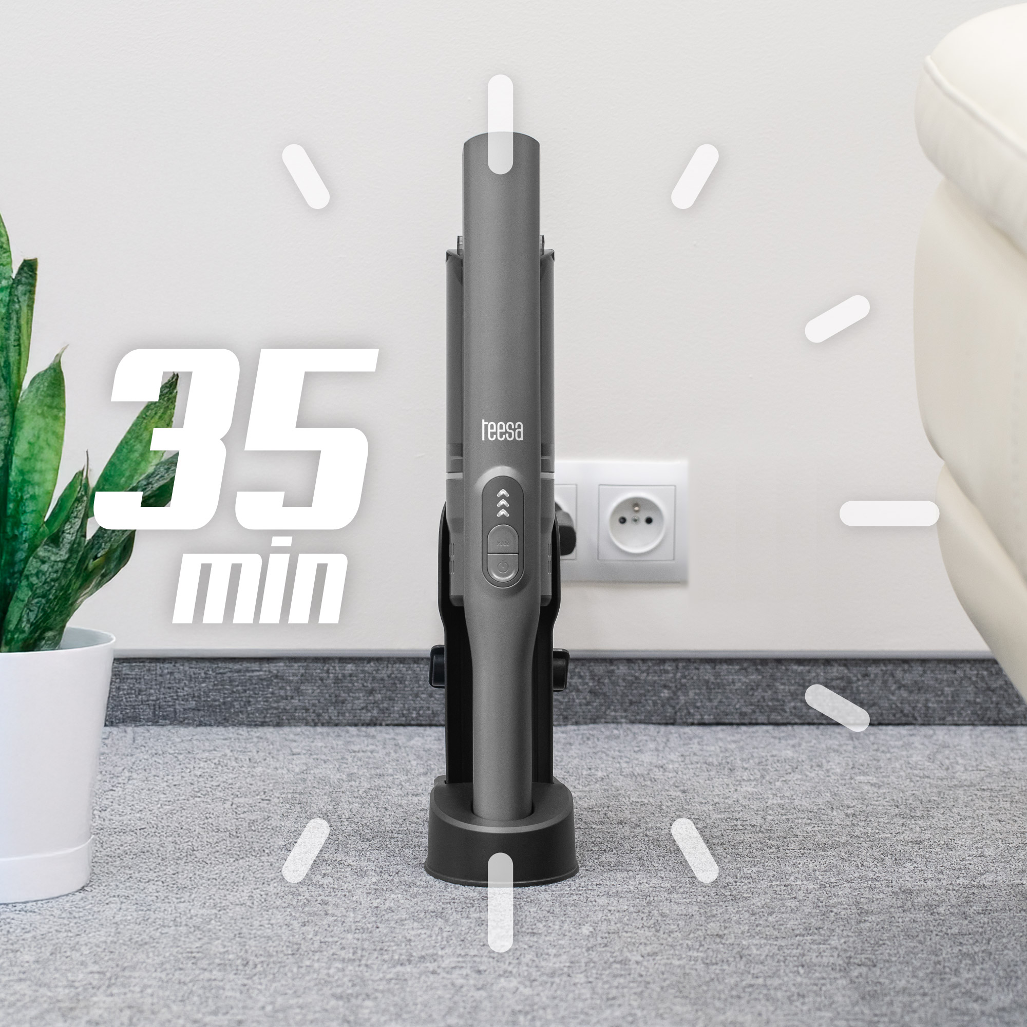 Akumulator o pojemności 2200 mAh zapewnia 35 minut nieprzerwanego działania. Tak długi czas pracy sprawia, że bez problemu odkurzacz Teesa pomoże sprzątnąć auto lub wyczyścić dowolne powierzchnie w Twoim domu.