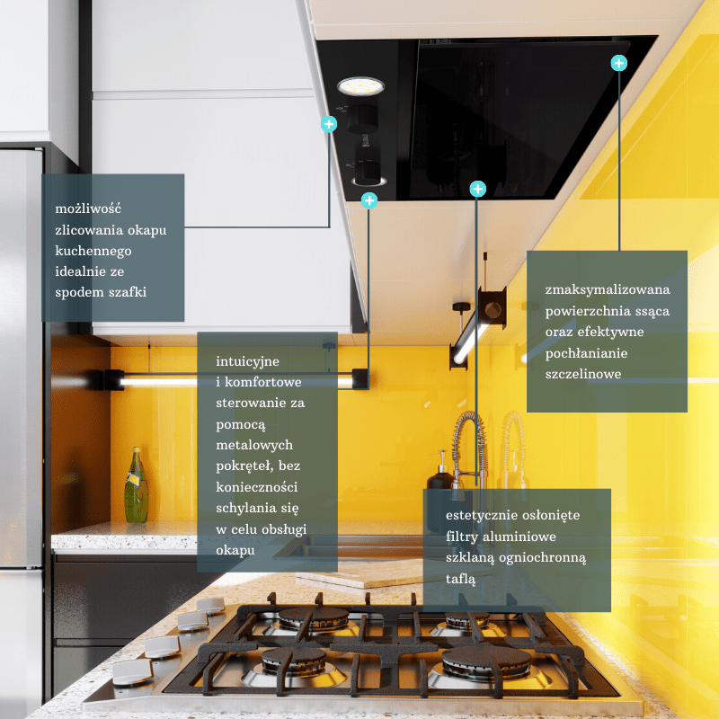 - Schowany w szafce okap jest cichy (45 dB na pierwszym biegu), a więc nie powoduje dyskomfortu wśród osób przebywających w kuchni.