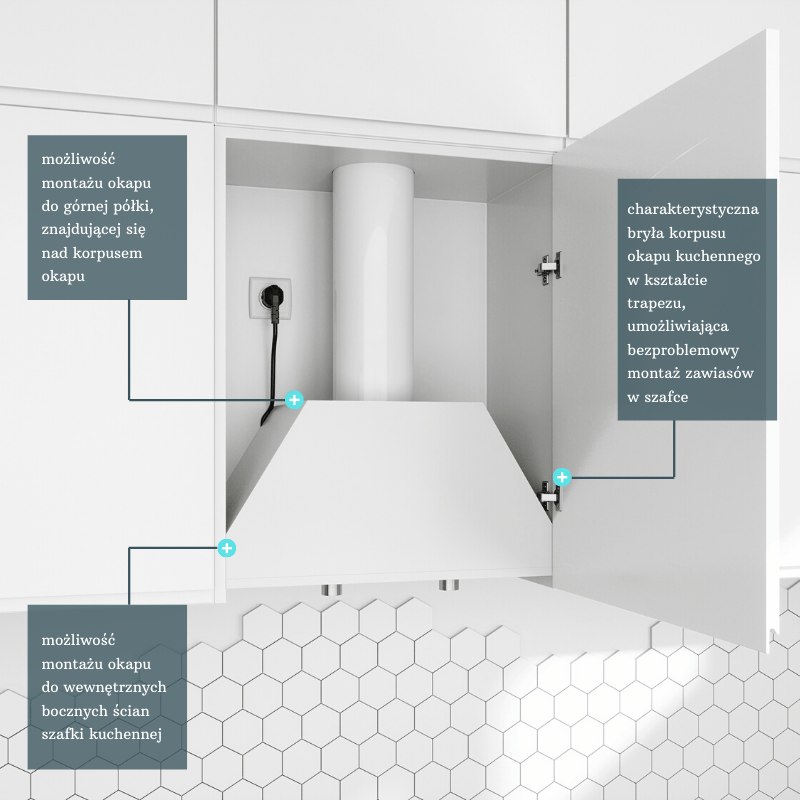 - Schowany w szafce okap jest cichy (45 dB na pierwszym biegu), a więc nie powoduje dyskomfortu wśród osób przebywających w kuchni.