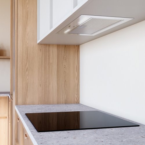 Flueris 60.1 wykonany jest z wysokiej jakości stali nierdzewnej, co zapewnia nie tylko elegancki wygląd, ale także trwałość i odporność na uszkodzenia. Cienka ramka sprawia, że okap idealnie wkomponowuje się w dolną krawędź szafki, stając się niemal niewidoczny.
