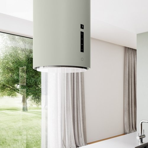 Okap kuchenny GLOBALO Miraya Isola 39.1 Sage to stylowy, cylindryczny okap wyspowy w modnym odcieniu szałwiowym, który doskonale wkomponuje się w każdą kuchnię. Jego nowoczesny design oraz funkcjonalność sprawiają, że jest idealnym wyborem dla tych, którzy cenią sobie zarówno estetykę, jak i efektywność w kuchni.