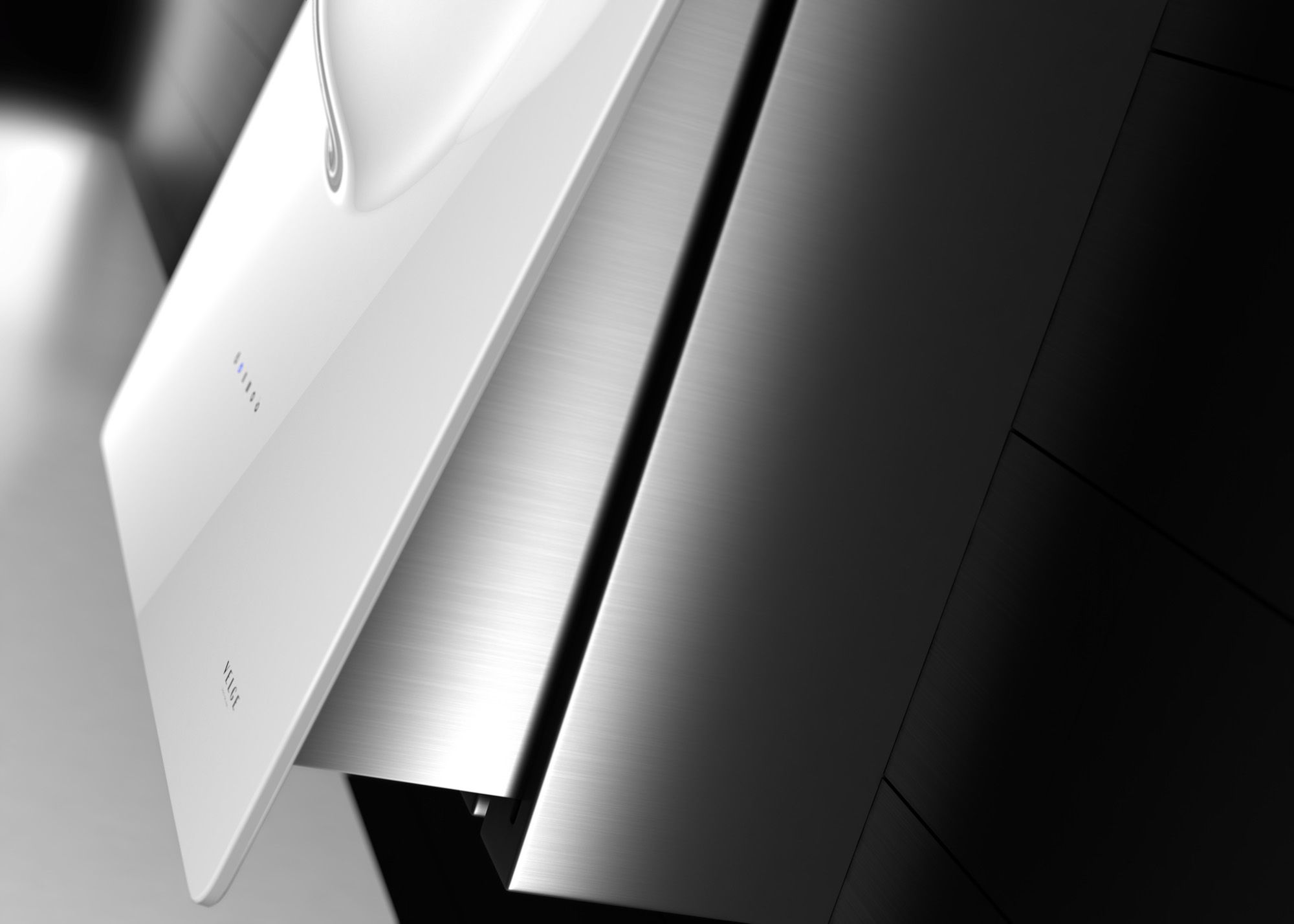 - Wygląd: Unikatowy okap z systemem Slow Motion Opening, dzięki któremu okap ma głębokość zaledwie 211mm gdy nie pracuje oraz 340mm podczas pracy.