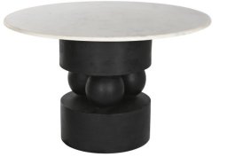 Okrągły stół wykonany z drewna mango oraz eleganckiego marmuru tworzy harmonijną kompozycję idealną do nowoczesnych i klasycznych aranżacji. Podstawę stołu stanowi solidna noga z drewna mango pomalowana na głęboki czarny kolor. Zapewnia ona stabilność i trwałość konstrukcji. Okrągły blat z marmuru nadaje wnętrzu luksusowego charakteru, a unikalne żyłkowanie kamienia sprawia, że każdy egzemplarz jest niepowtarzalny.