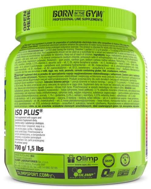 Olimp Iso Plus to zaawansowana odżywka nawadniająca, która pozwala na przygotowanie napoju izotonicznego. Dostarcza najważniejsze minerały oraz odpowiednią porcję węglowodanów o zróżnicowanym indeksie glikemicznym. W przeciwieństwie do innych produktów – skład został wzbogacony o L-glutaminę i L-karnitynę. Dzięki temu nie tylko wyrównuje gospodarkę wodno-elektrolitową, ale również poprawia zdolności wysiłkowe.