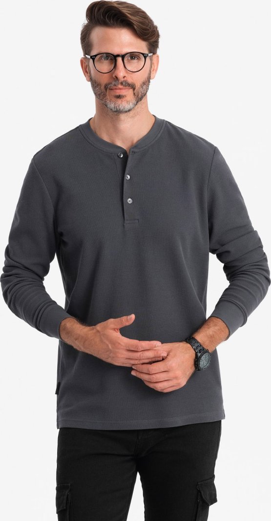 Ombre Męski longsleeve zapinany pod szyją z dzianiny waflowej grafitowy V3 OM-LSCL-0120 M