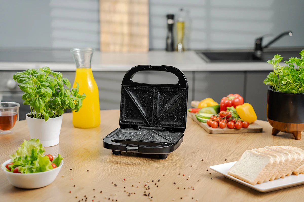 Opiekacz do kanapek o mocy 750 W pozwala na przygotowanie dwóch kanapek jednocześnie, a nieprzywierające płyty i automatyczna regulacja temperatury zapewniają wygodne i równomierne opiekanie. Wyposażony w kontrolki działania, bezpieczne zamknięcie, nóżki antypoślizgowe i możliwość przechowywania w pionie, świetnie sprawdzi się w każdej kuchni.