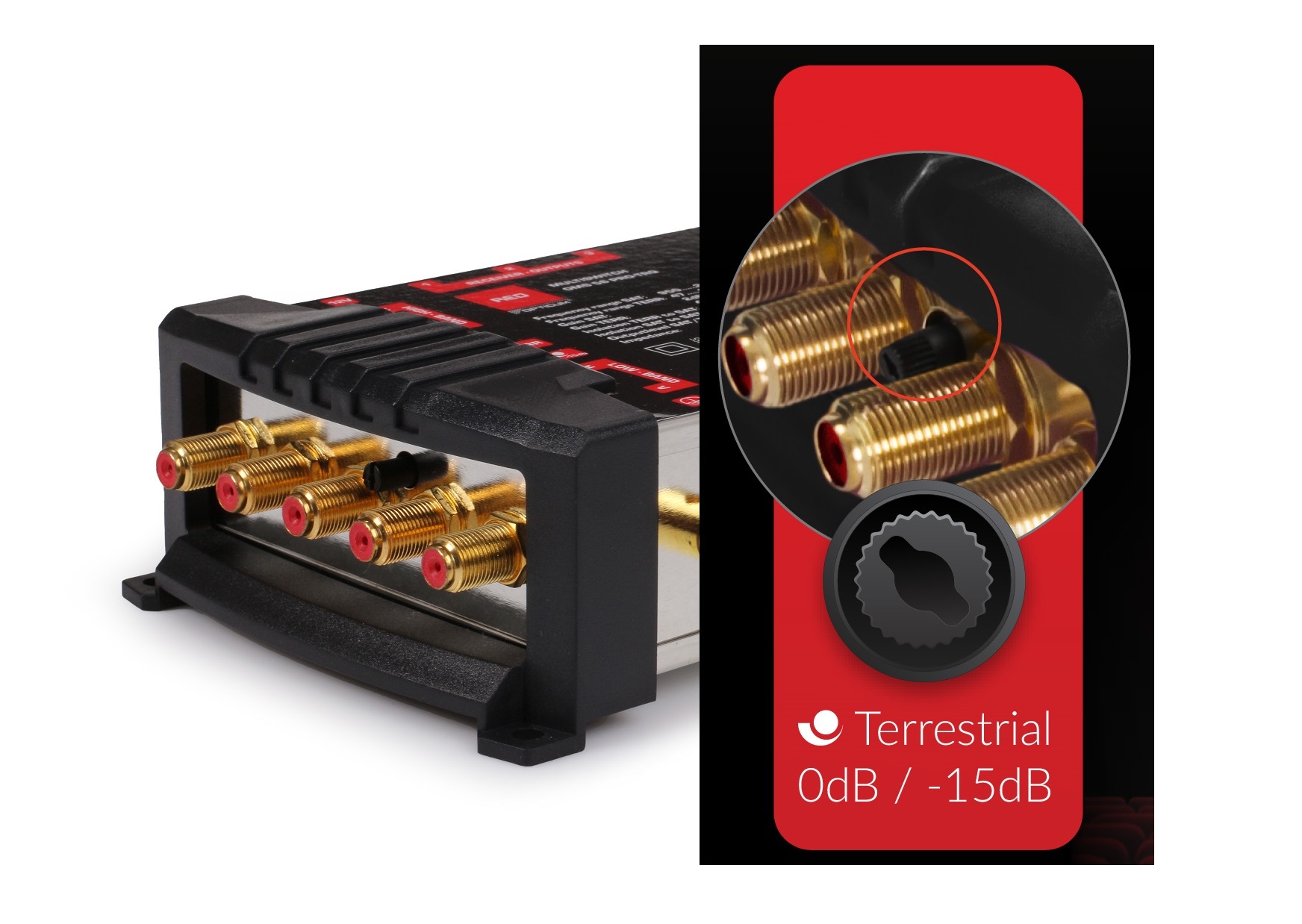 Zasilanie multiswitcha odbywa się za pośrednictwem zewnętrznego zasilacza dzięki czemu wyeliminowane jest zjawisko zwiększonej temperatury pracy będące częstym powodem uszkodzeń urządzenia.