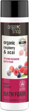 Organic Shop Berry Delight Bath Foam stworzony na bazie naturalnych składników, w tym korzystnych dla skóry jagód Acai. Płyn dostarcza skórze wiele witamin, dzięki czemu ta staje się zdrowsza i ładniejsza. Płyn jest delikatny dla skóry, więc może być używany także przez alergików.