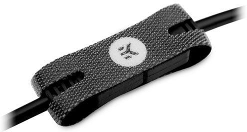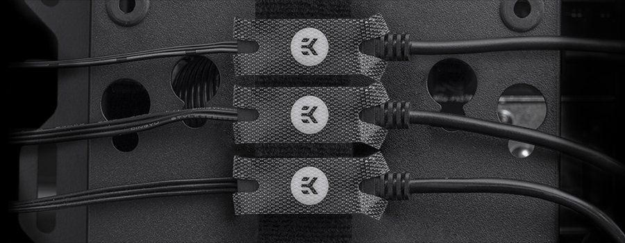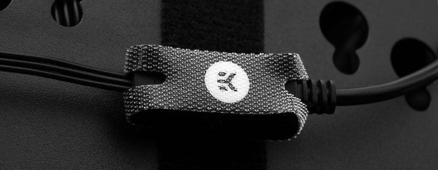 Te stylowe zapięcia na rzepy otaczają połączenie złączy RGB z każdej strony i łączą je ze sobą. Oba kable są przeciągane przez łącznik, połączone, a na końcu łącznik jest owinięty wokół całego złącza, aby uniemożliwić rozłączenie głowicy. Te zapięcia na rzepy są czarne z subtelnym szarym logo EK na środku, które jest widoczne po umieszczeniu systemu zarządzania kablami.