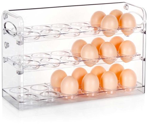 Organizer do przechowywania 36 jajek w lodówce na trzech różnych poziomach. Wykonany z tworzywa w przezroczystym kolorze. Możliwość umieszczenia go na drzwiach lodówki. Pojemnik na 36 jajek - Praktyczny pojemnik do przechowywania dużej ilości jajek. Pojemnik na jajka o wymiarach 32 x 10 x 20,5 cm. Pozwoli na przechowywanie 36 jajek po 12 na każdym poziomie. Solidnie wykonany - Wykonany z najwyższej jakości tworzywa w przezroczystym kolorze. Pojemnik posiada dedykowane miejsca na jajka co umożliwi łatwe i bezpieczne przechowywanie jajek. Trzy poziomy przechowywania - Dzięki trzypoziomowej konstrukcji jajka są bezpiecznie przechowywane. Każdy poziom pojemnika umożliwiają łatwy dostęp do jajek z możliwością podnoszenia każdego poziomu zapewniając wygodny dostęp do jajek z poziomu niższego, jeśli wyższy poziom jest już pusty. Rozwiązanie to zabezpiecza je przed uszkodzeniem lub zmiażdżeniem. Funkcjonalna konstrukcja - Dzięki specjalnym wgłębieniom na jajka, są one stabilnie umieszczone, co zapobiega ich toczeniu się i zmniejsza ryzyko uszkodzeń podczas przechowywania. Pojemnik posiada z boku uchwyty, które ułatwią przenoszenie. Pojemnik możemy umieścić również na drzwiach lodówki (należy sprawdzić wymiar organizera, czy do danego modelu lodówki, pojemnik będzie pasował). Łatwe czyszczenie - Pojemnik na jajka wyczyścimy w łatwy i wygodny sposób przy użyciu wody i gąbki. Odporny na temperaturę od -40° C do 50°C.Pojemnik na 36 jajek, wykonany z wytrzymałych materiałów. Pozwoli na bezpieczne przechowywanie jaj w lodówce na trzech poziomach. Sprawia, że jajka dłużej pozostają świeże. Łatwy w użytkowaniu. Sprawdzi się w każdej lodówce. Pojemnik na jajka jest wielokrotnego użytku i świetną alternatywą dla papierowych wytłoczek. Całkowicie bezpieczny dla zdrowia i neutralny dla żywności. Oryginalny produkt marki Vilde. Wyprodukowano zgodnie z europejskimi standardami....