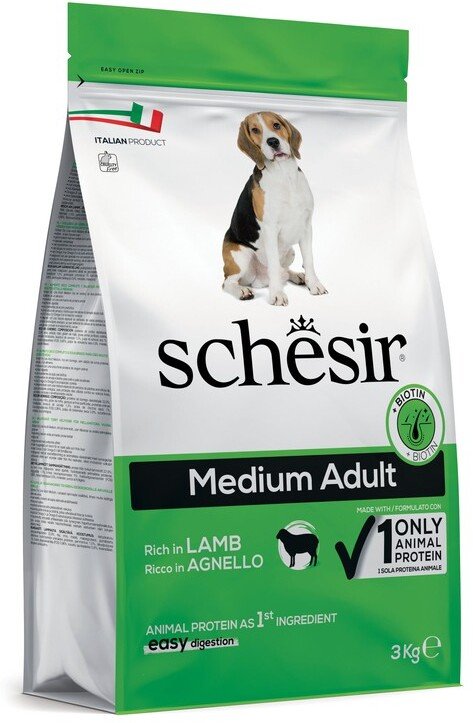 Karma Schesir jest idealnie dopasowana do potrzeb żywieniowych dorosłych psów średnich ras (10-25 kg). Dzięki zbilansowanej formule, Twój pies otrzyma wszystkie niezbędne składniki, które wspierają jego aktywność i zdrowie przez cały dzień.