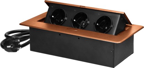 Gniazdo meblowe wpuszczane w blat z płaskim frezowanym rantem i przewodem 1,5m, 3x2P+Z (Schuko), złote