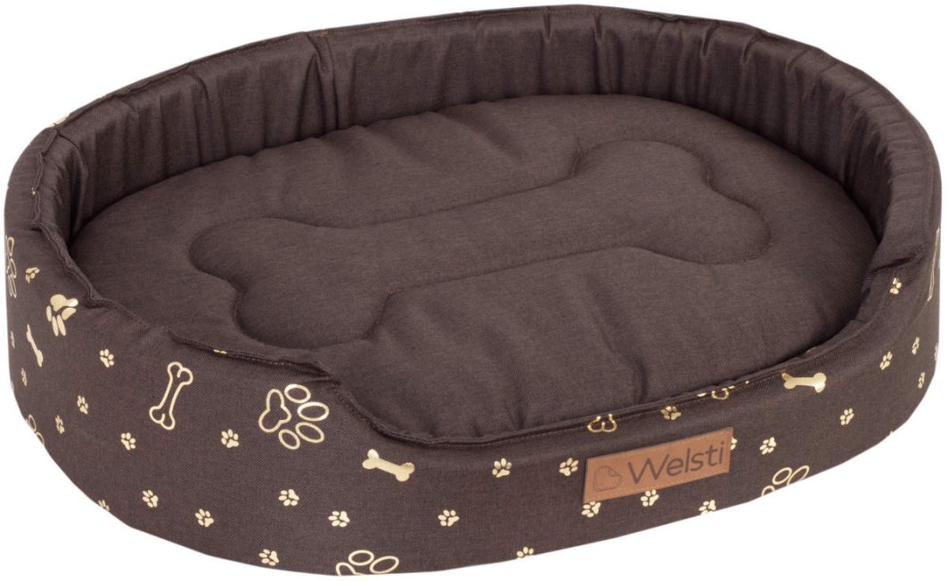 Owalne legowisko kojec dla psa Welsti brązowy złote kości i łapki XXL 100x80 wigofil