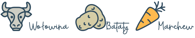 Świeże mięso wołowe Angus 28%, suszone mięso wołowe 19%, bataty, ziemniaki, groszek (5%), rosół z wołowiny 3%, siemię lniane, pulpa buraczana, minerały, witaminy, suplement omega-3, bulion warzywny, marchew (