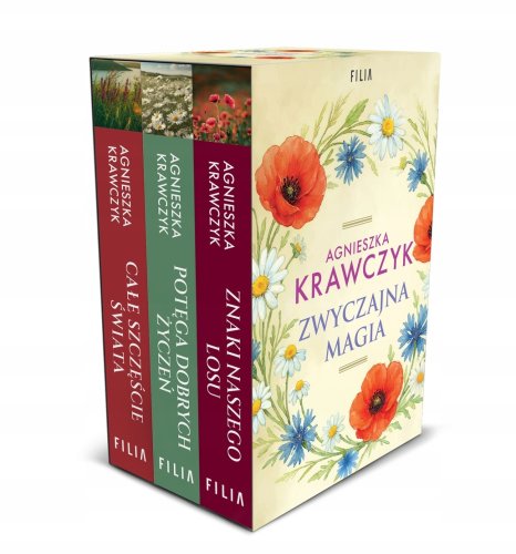 Pakiet trzech powieści autorstwa Agnieszki Krawczyk to znakomita propozycja dla entuzjastów literatury obyczajowej. "Całe szczęście świata", "Potęga dobrych życzeń" oraz "Znaki naszego losu" to opowieści, które poruszają serca i skłaniają do refleksji nad miłością, przyjaźnią oraz wyzwaniami, jakie stawia przed nami życie. Każda z części przenosi czytelnika w malownicze scenerie, gdzie bohaterki stają w obliczu emocjonalnych zawirowań i odkrywają nowe ścieżki życiowe.