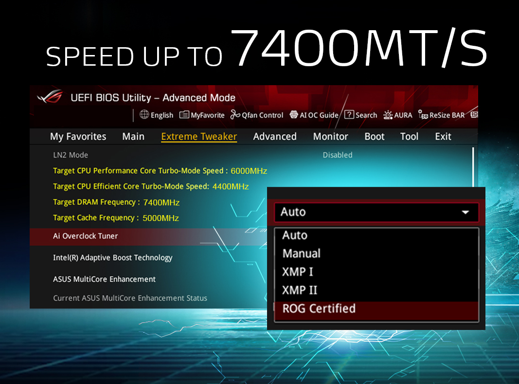 Pamięć XPG LANCER RGB ROG CERTIFIED została poddana dokładnym testom ROG w celu zapewnienia zgodności z płytami głównymi z serii ROG Intel® DDR5. Oznacza to, że użytkownicy ROG mogą korzystać z gwarantowanych możliwości przetaktowywania o poziomach optymalizacji, z którymi inne moduły pamięci DRAM nie są w stanie konkurować. Po włączeniu w systemie BIOS trybu „ROG Certified” (Certyfikat ROG) pamięć DRAM będzie mogła działać z szybkością do 7400 MT/s dzięki funkcji przetaktowania jednym kliknięciem, zapewniając lepszą jakość grania w gry.