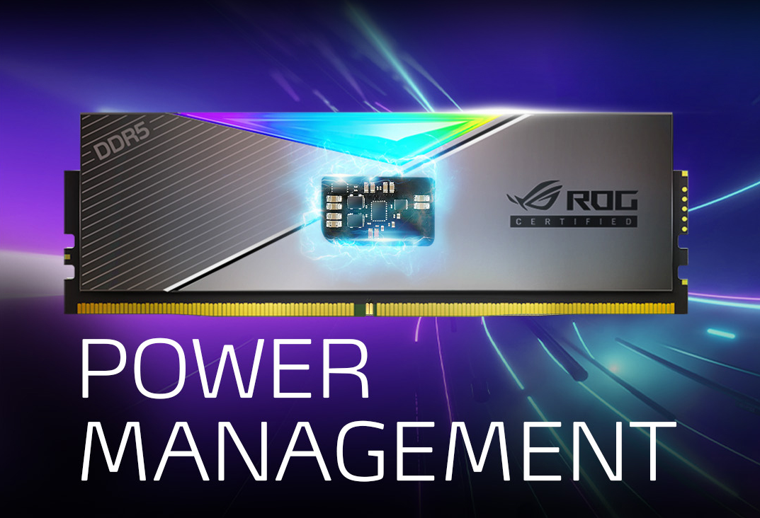 Moduł pamięci ROG CERTIFIED LANCER RGB ma wbudowany układ scalony zarządzania zasilaniem (PMIC), który zwiększa stabilność zasilania. Dzięki niższemu napięciu roboczemu moduł LANCER jest także bardziej energooszczędny niż pamięć DDR4.