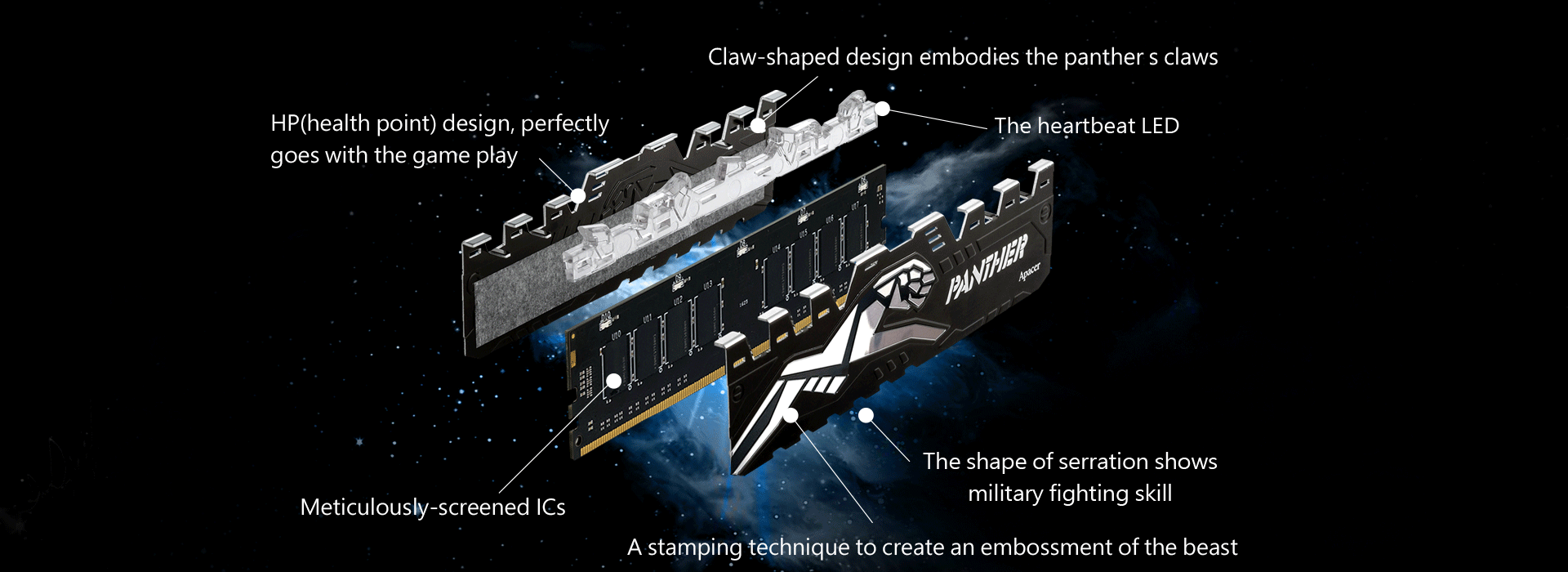 Żadna pantera nie może być ostra bez ostrych zębów. Firma Apacer opracowała ekskluzywną, opatentowaną technologię homogenizacji światła, która pozwala na bardziej ekstrawaganckie wzory oświetlenia przy jednoczesnym zachowaniu jednolitej prezentacji. Unikalnie zaprojektowany pasek oświetleniowy LED inspirowany jest chwytem pantery.