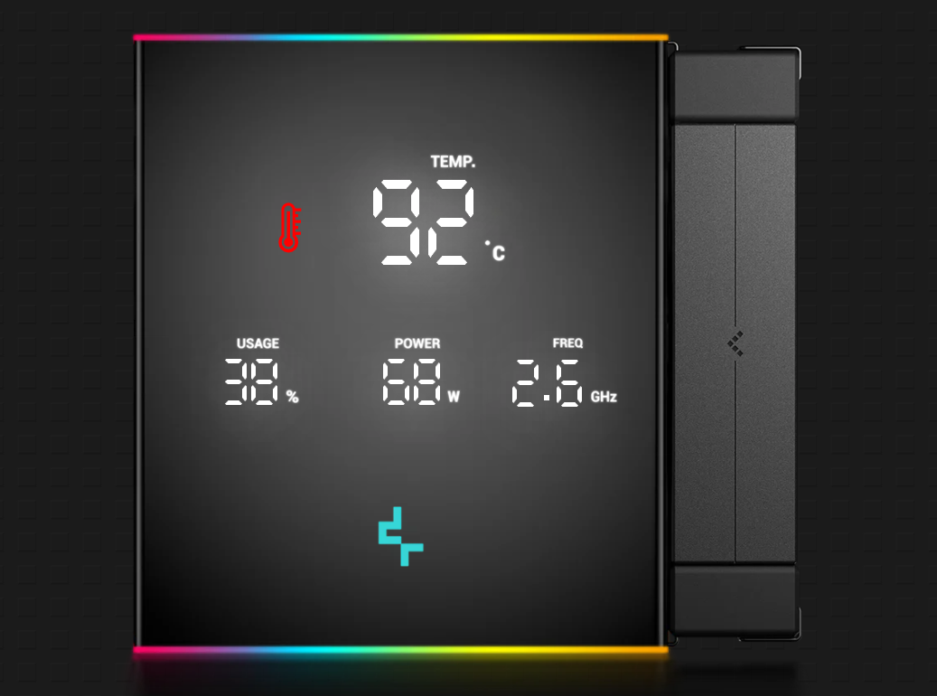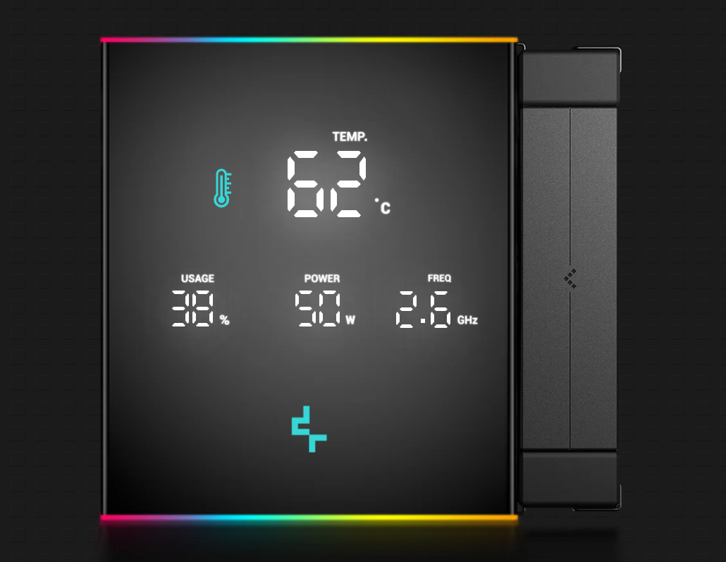 Elegancki i błyszczący ekran AK620 DIGITAL PRO został ulepszony, aby pokazywać więcej niż tylko temperaturę; zużycie, moc i częstotliwość zostały dodane i są wyświetlane w tym samym czasie. Wyświetlacz jest kontrolowany przez oprogramowanie DeepCool i wymaga jedynie otwartego złącza USB 2.0.