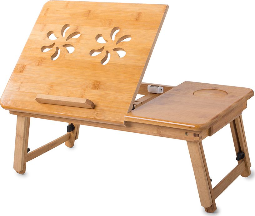 Wykonanie z naturalnego, impregnowanego drewna bambusowego. Specjalne otwory zapobiegają przegrzewaniu się komputera. Możliwość regulacji stopnia nachylenia blatu. Wbudowana szufladka do przechowywania drobnych przedmiotów. Listwa uniemożliwiająca zsunięcie się komputera. Płynna regulacja długości nóżek. Szybkie i proste składanie