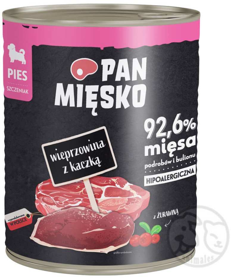 Karma mokra dla psów Pan Mięsko Wieprzowina z kaczką to znakomity wybór dla szczeniąt, które potrzebują zbilansowanego i pełnowartościowego pożywienia. Dzięki starannie wyselekcjonowanym składnikom, ta karma dostarcza niezbędnych wartości odżywczych, wspierając prawidłowy rozwój Twojego pupila.