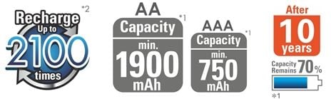 Poprzez ulepszenie wielkości kratki ze stopu wodorkowego, eneloop zachowuje 70% pojemności nawet po 10 latach przechowywania. W niskich temperaturach utrzymuje wyższe napięcie niż baterie tradycyjne.