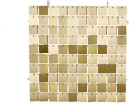 Panel cekinowy, cekiny w kształcie kwadratów, w kolorze jasnego złota, wymiar ok. 30x30 cm. Panele cekinowe posiadają zatrzaski na bokach, które umożliwiają łączenie paneli kwadratowych w spójną całość - patrz instrukcja na karcie produktu. Połączone panele idealnie pasują na stojak SNT5-150-019, które można zamontować używając żyłki. Panele tworzą niesamowity efekt dzięki blaszkom, które ruszają się wskutek ruchu powietrza.