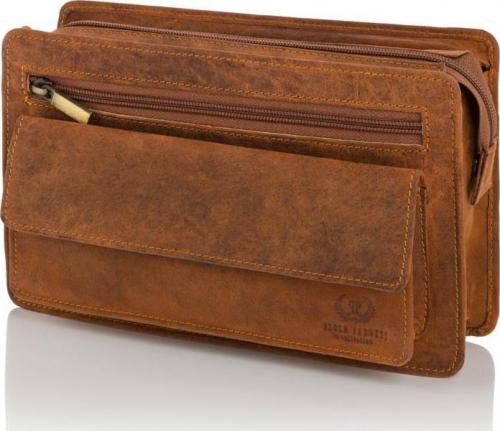 Saszetka męska do ręki Paolo Peruzzi, wykonana ze skóry naturalnej hunterowej, stylizowanej na vintage. Możliwość noszenia saszetki w dłoni lub na pasku, wokół nadgarstka. Typowej wielkości saszetka posiada dwie frontowe kieszenie - jedną na suwak, drugą zamykaną klapą na napy z magnesem. Komora główna zapinana na suwak, tylna kieszeń również na zamek błyskawiczny. Poręczny, klasyczny model spełniający wszystkie męskie, codzienne potrzeby.