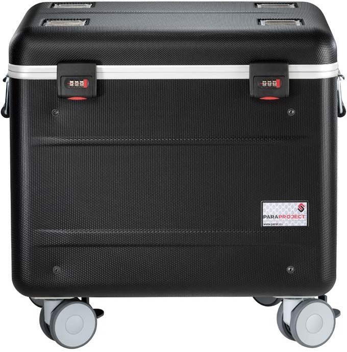 Wózek Parat Paraproject Case i10 został zaprojektowany z myślą o mobilności. Wyposażony w teleskopową rączkę oraz kółka, umożliwia łatwe przemieszczanie się z jednego miejsca do drugiego, co jest niezwykle przydatne w dynamicznych środowiskach edukacyjnych.