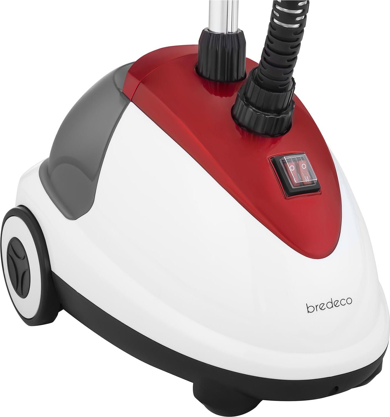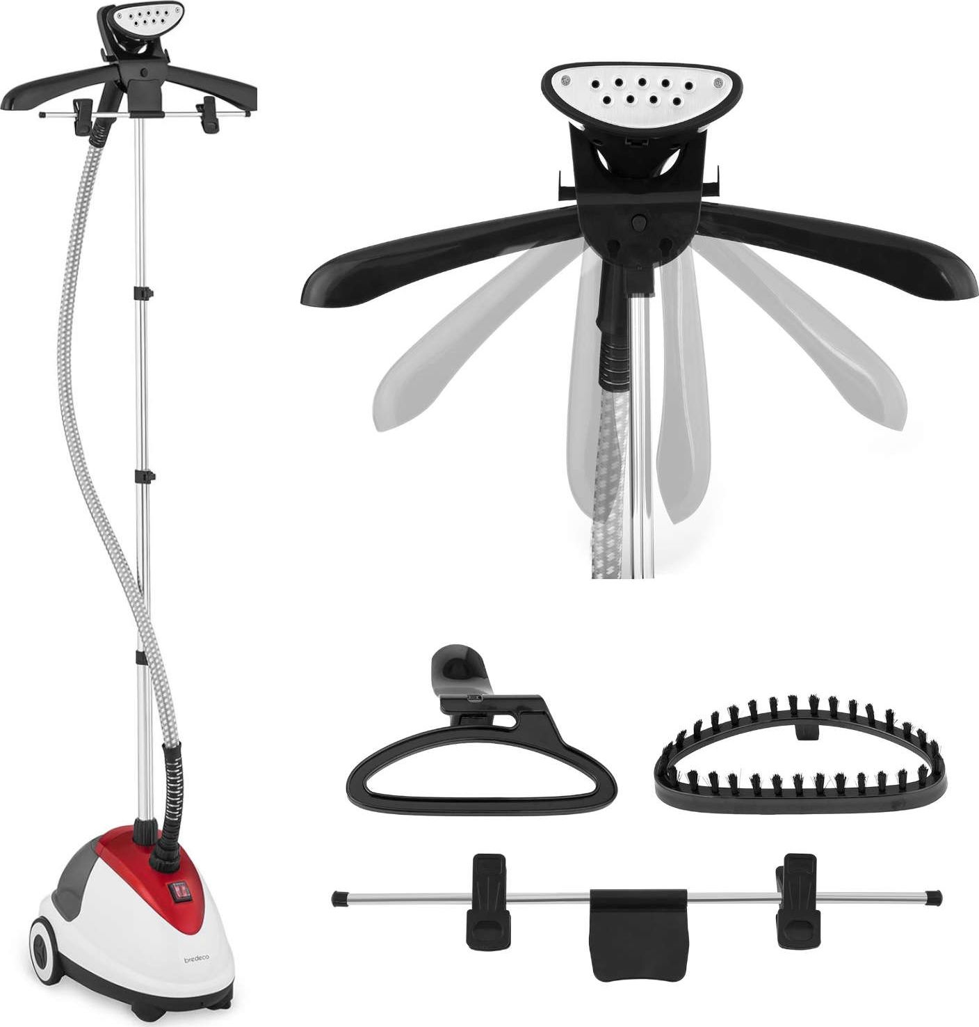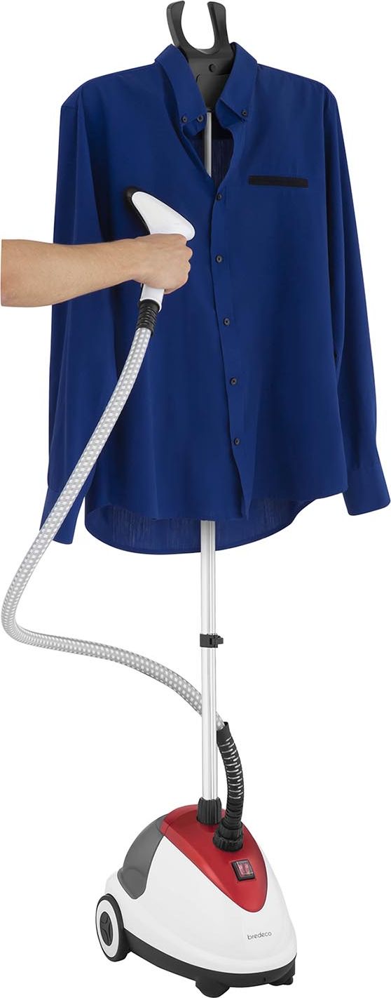 Profesjonalna stacja parowa Bredeco to wydajne urządzenie służące do czyszczenia oraz prasowania w pionie ubrań, firan i innych tkanin. W zależności od potrzeb moc urządzenia jest regulowana (600, 900, lub 1500 W), a energooszczędna grzałka doprowadza wodę do właściwej temperatury w 45 s.