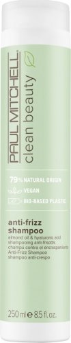 Paul Mitchell Czysta Uroda Anty-Friz to wegański szampon wygładzający, przeznaczony dla niezdyscyplinowanych i puszących się włosów. Delikatnie oczyszcza i wygładza włosy, zapewniając im gładkość, łatwość rozczesywania i podatność na stylizację. Szampon jest w 100% wegański, nie zawiera parabenów, silikonów i alkoholu. Jego skład opiera się na 79% naturalnych składnikach, w tym na ekstrakcie z olejku migdałowego i kwasie hialuronowym, które zmniejszają puszenie się włosów i nadają im gładkość. Opakowanie zostało wykonane z bioplastiku, który neutralizuje więcej dwutlenku węgla, niż emituje, i podlega 100% recyklingowi.